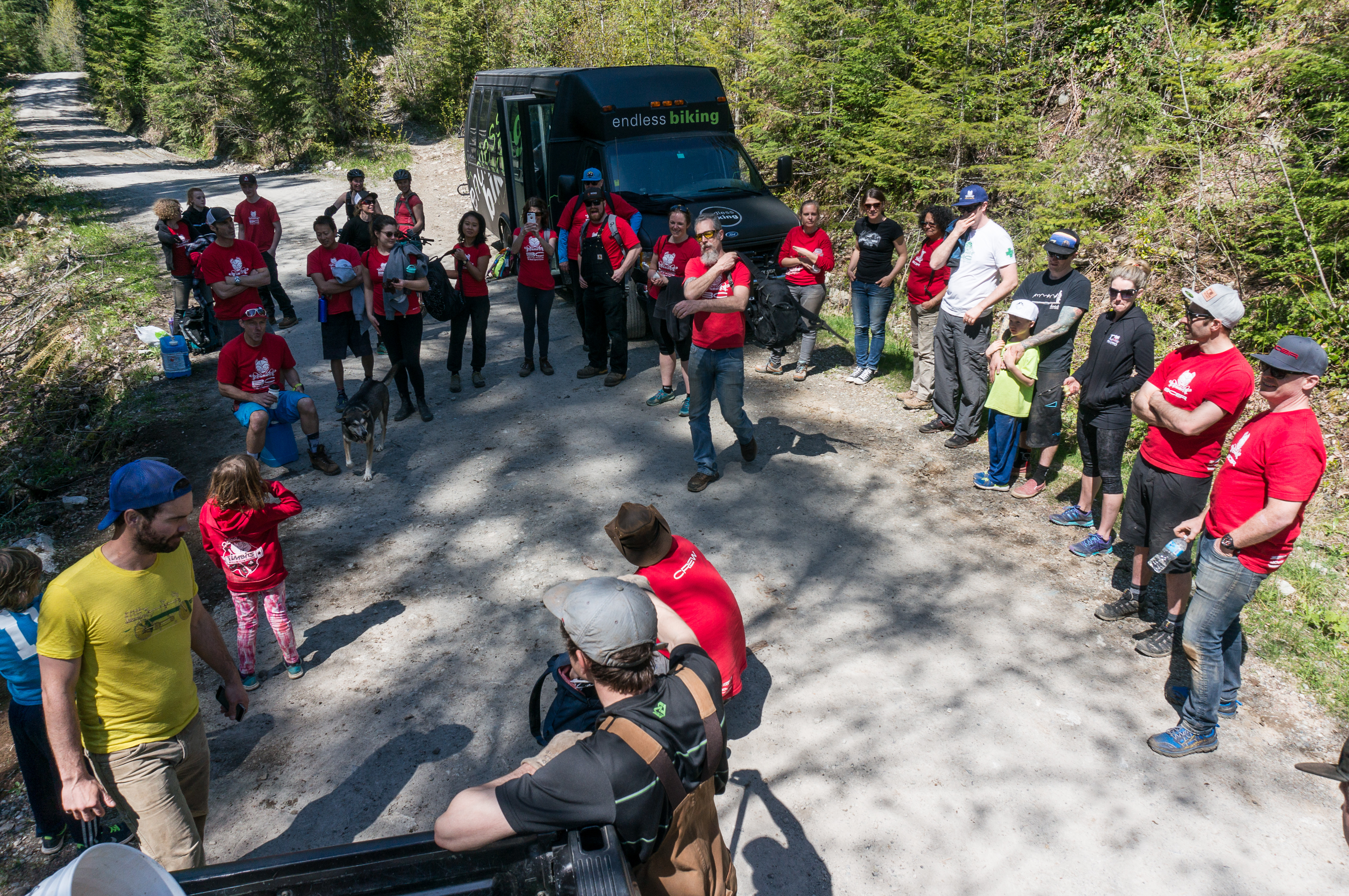 On this past weekend, some of the BCBR crew met up early at our office in North Vancouver to be shuttled to Squamish for a trail day. Volunteering their time and their Sunday, 32 people arrived to put in some hours work on the iconic Psueda Psuega trail – which is also part of the Day 6 BC Bike Race course. With community support from Bean Around the World (who provided coffee and tasty muffins), Endless Biking (who provided our shuttle), Corsa Cycles (who hosted our post trail day BBQ), Red Truck Beer Company (who provided our refreshments) and SORCA (who provided a team of experienced trail builders to guide our efforts) the day was a huge success!